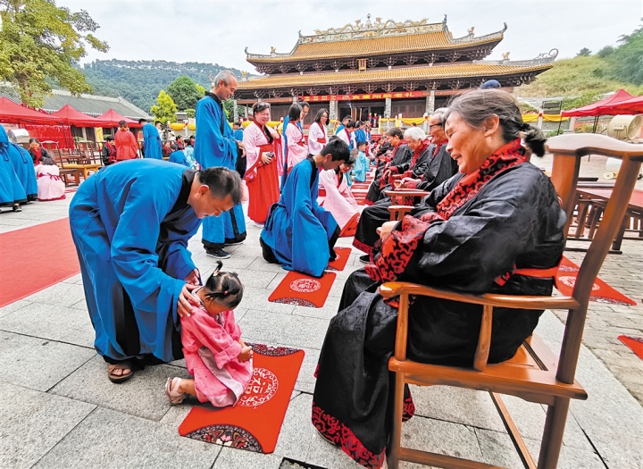跪拜礼是中国使用年代最长,最隆重的礼节,也是当天仪式中的重要环节。在参礼家庭之中,管礼邦一家六口四代同堂,26岁的他一面向父母及外公行跪拜礼,一面示意2岁的儿子管智宸学着他的模样行礼。“外公今年86岁了,我的父母一直和他住在一起,方便照顾,我们小辈也经常回去和老人聊天。”在管礼邦看来,言传身教就是最好的教育。