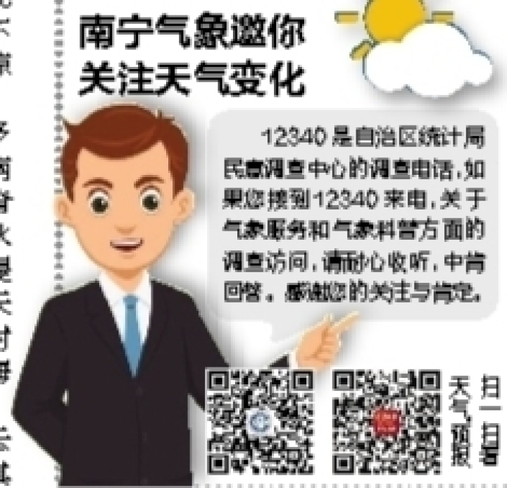 南宁气象台预计,今日白天,南宁多云到晴,气温20~31℃,东北风1~2级。其中,今日上午,南宁市区、武鸣区、马山县以晴到多云天气为主,气温20~29℃,东北风1~2级,相对湿度50%~80%;下午,多云,气温24~31℃,东北风1~2级,相对湿度40%~60%。今晚到明日,马山县、柳州市多云。