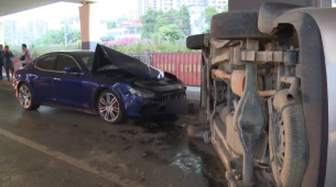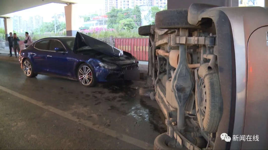 10月31日下午4时30分左右,在南宁市园湖北路,一辆价值上百万元的玛莎拉蒂轿车和一辆面包车发生碰撞,玛莎拉蒂的引擎盖严重变形,面包车因撞击侧翻在地。