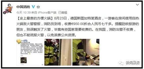 近日,中国消防发了这么一条微博,称中国某游客在德国斯图加特某酒店,因使用自热火锅,导致酒店火警警报,消防车和消防队齐齐出动。