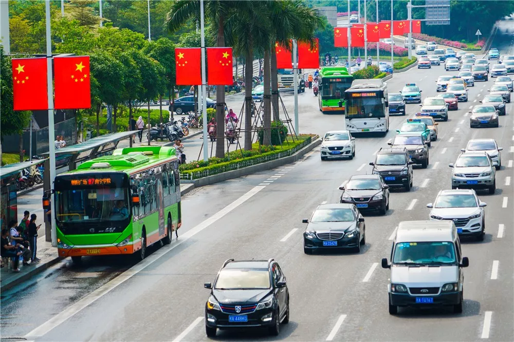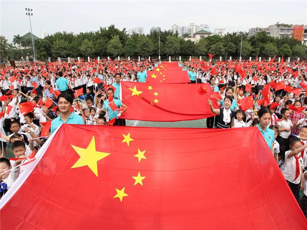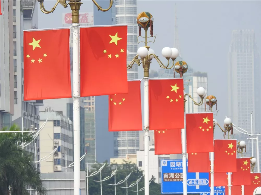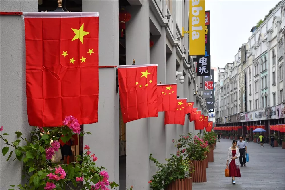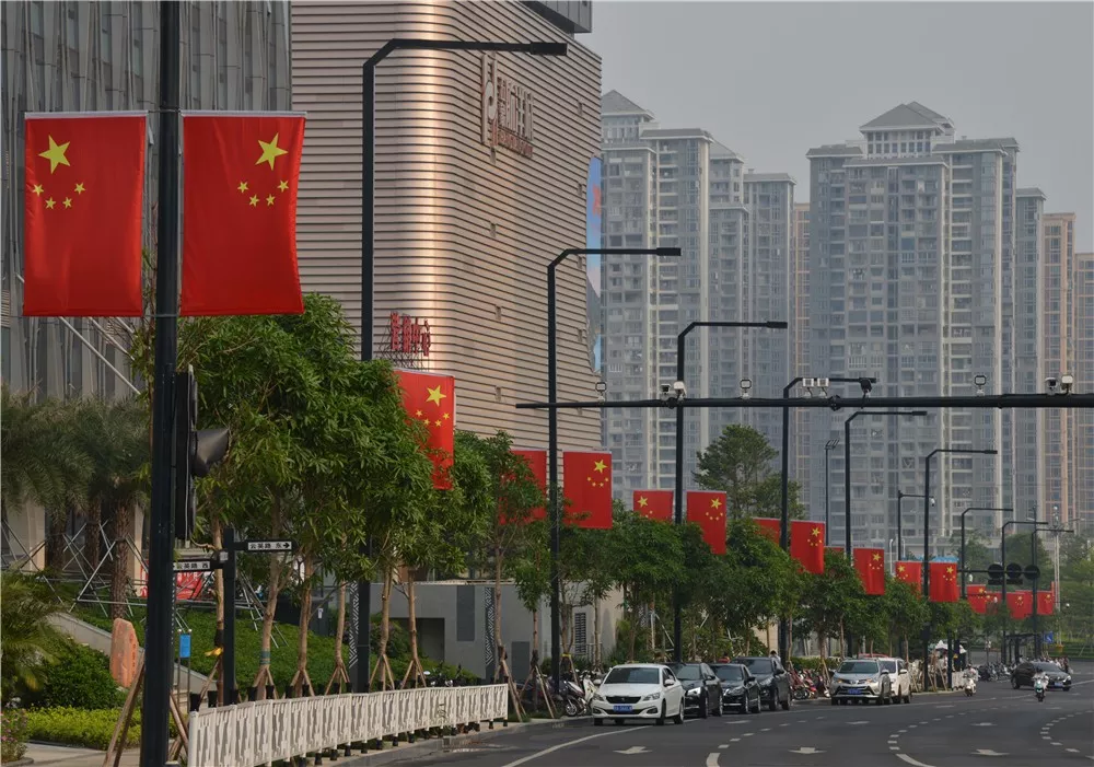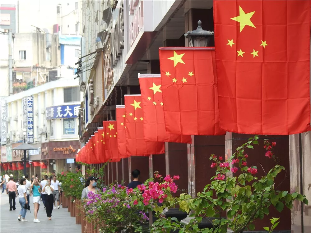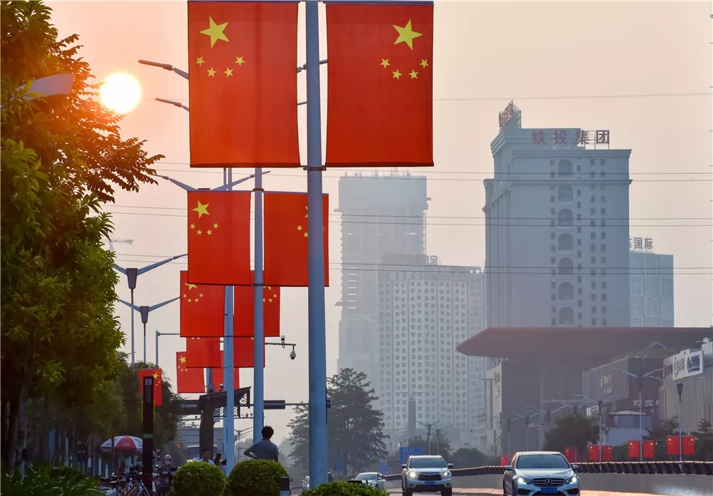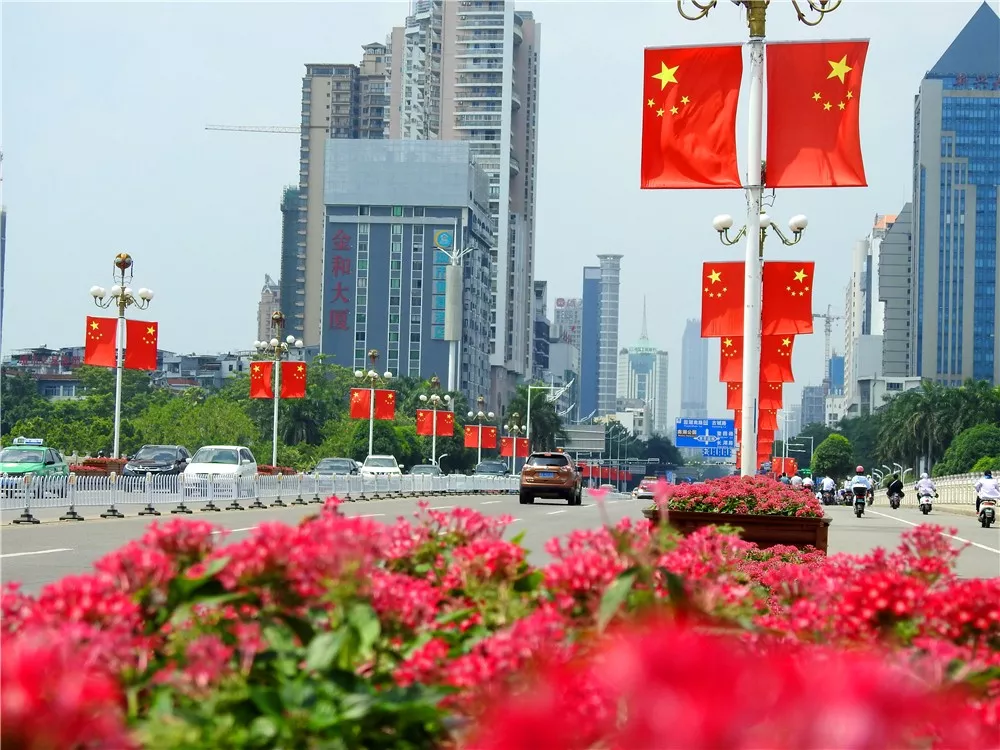 在民族大道的南湖桥上,道路两旁的路灯上悬挂起鲜艳的五星红旗,庄重热烈、熠熠生辉;在桃源路上,“国旗红”扮靓路口街头,“红色海洋”与绿树碧草交相辉映。在民生路、亭洪路、大学路、武华路、科德路、红星路、五象大道等39条主干道上,都悬挂上了整齐划一的五星红旗,“国旗一条街”遍布我市各县(区)、开发区。